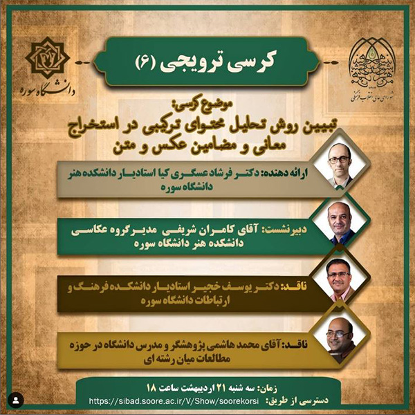 - Lecture at the Iranian Academy of Art about “Art Research Methods in Iran: Structuralism in the Lack of Ideas and the Lack of Problematic View”, 2017