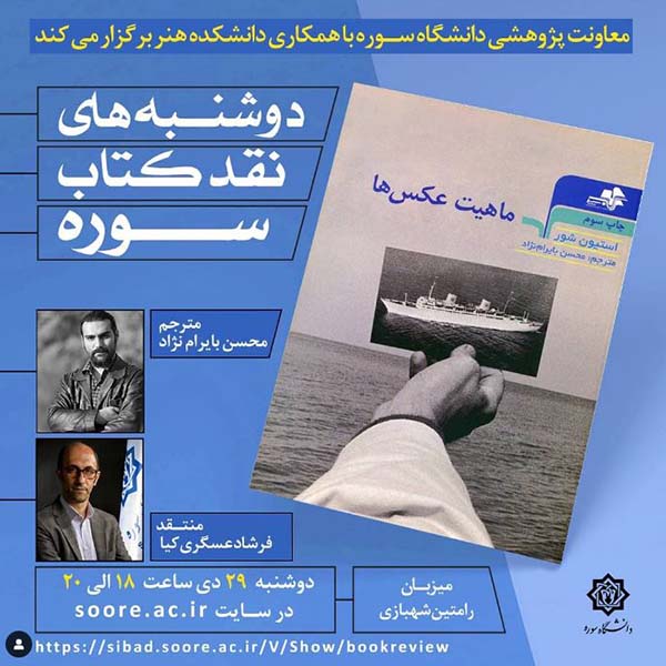 - Critique of the book “The Nature of Photographs” by Stephen Shore and translated by Mohsen Bayramnejad in Fourteenth book review session of Soore, 2021